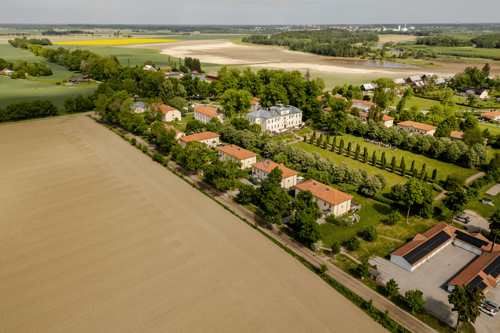 Ni når bostaden via liten grusväg och framför bostadens entré finns en trevlig uteplats där ni gärna sitter och njuter av utsikten över omkringliggande ängar och åkermark. Ni kliver sedan in i den inbjudande hallen med god uppsikt över nedervåningen och plats för avhänging av ytterkläder i bland annat klädkammare och garderober. Direkt till vänster om hallen finns bostadens fina kök med gott om plats för förvaring bakom ljusgröna skåpluckor. Här finns maskinell utrustning i form av; hel kyl och frys, diskmaskin, häll, integrerad ugn och mikrovågsugn. Köket ger också utrymme för matplats med platsbyggd sittbänk intill fönster mot uteplatsen på framsidan. Via köket når ni bostadens tvättstuga med tvättmaskin och utrymme för förvaring. På entréplan finns också våtutrymme med golvvärme samt WC/dusch. Vardagsrummet är mycket rymligt och erbjuder plats för avkoppling och fest. Från detta rum nås den härliga uteplatsen via ett charmigt burspråk till bostadens baksida och är en fantastisk plats att samla familj, släkt och vänner för att njuta av den härliga miljön som omgärdas av syrenbuske - vilket ger ett skönt insynsskyddat läge. Baksidan leder till allmänning där det finns gott om gräsytor, utsikt mot Haga Slott och lekplats för barn med spring i benen!