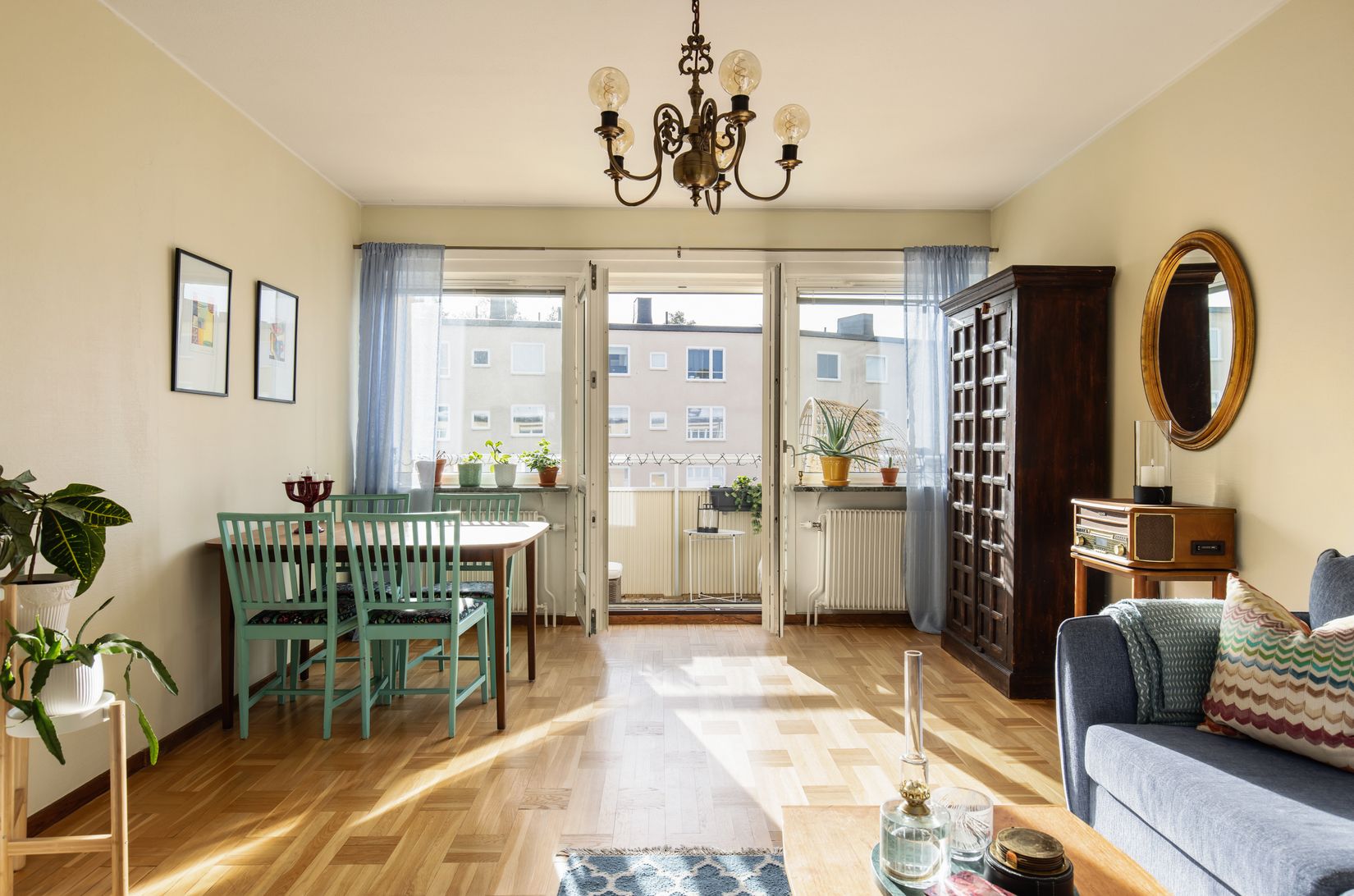Välkommen till denna ljusa och välplanerade lägenhet med balkong i bästa söderläge! Vardagsrummet imponerar med originaldörrar i glas, ekparkett och gott om plats för både soffgrupp och matsalsmöbel. Från rummet når du den stora balkongen – perfekt för soliga sommarkvällar med utrymme för möbler och grill.