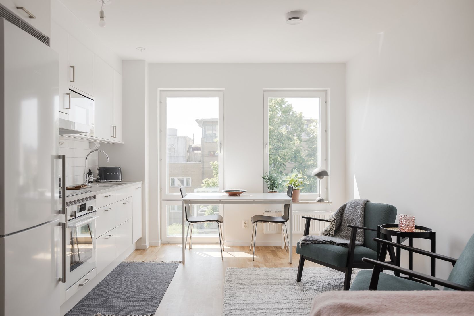 Direkt innanför dörren möts vi av en praktiskt hall med vita släta väggar som kompletteras med vackert parkettgolv, vilket återfinns i bostadens alla rum. I hallen ryms praktiska förvarings- och avlastningsmöbler och här finns även inbyggda garderober samt städskåp. Rakt fram nås bostadens hjärta - här samspelar köket och allrummet vilket framhäver en luftig atmosfär som skapar trevliga sociala ytor. Här finns gott om plats för både soffgrupp, matbord samt sovdel. Den uppskattade sovdelen separeras av en praktiskt avskiljningsvägg, som gör denna del av rummet till en mer avkopplande privat oas.