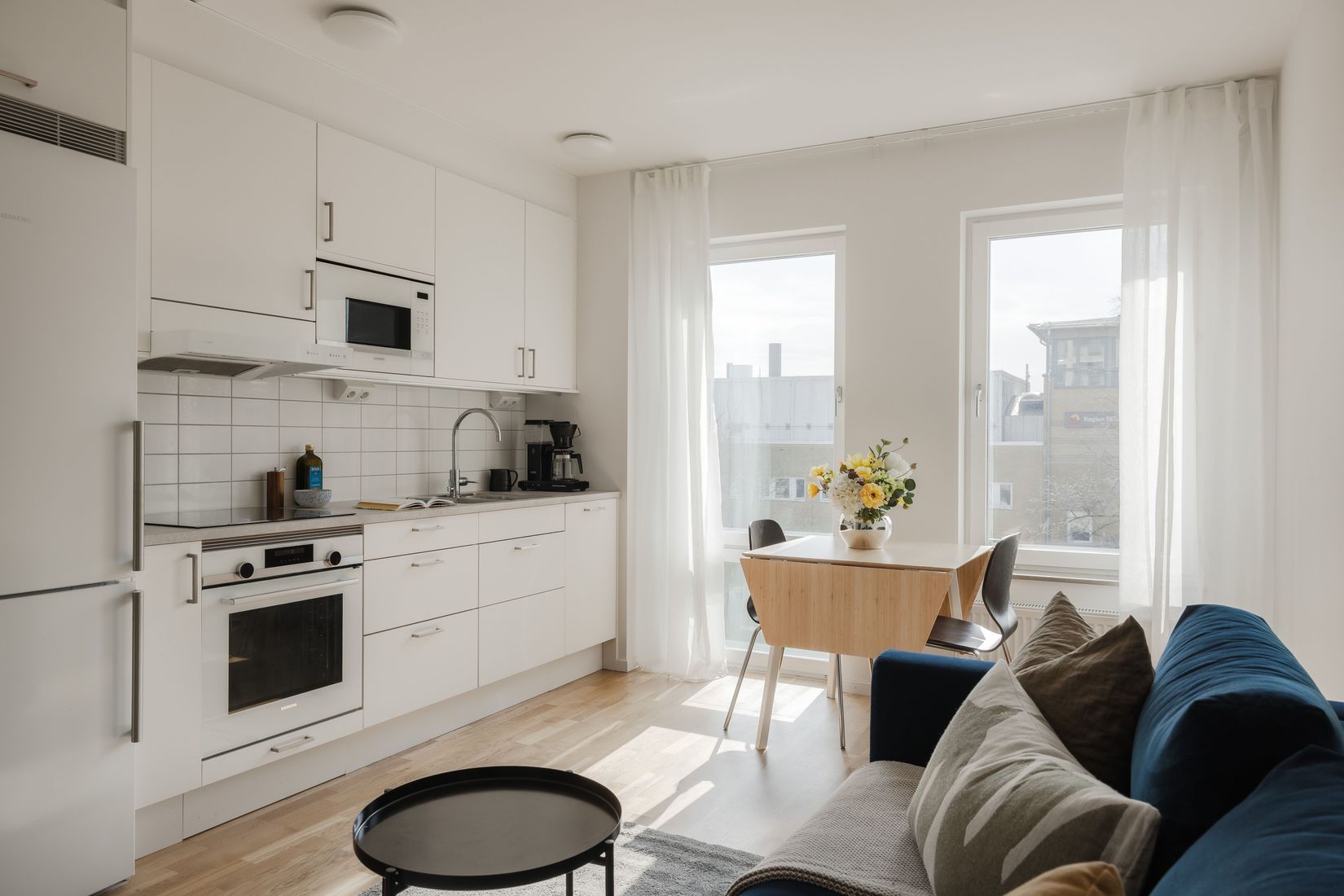 Direkt innanför dörren möts vi av en praktiskt hall med vita släta väggar som kompletteras med vackert parkettgolv, vilket återfinns i bostadens alla rum. I hallen ryms praktiska förvarings- och avlastningsmöbler och här finns även inbyggda garderober samt städskåp. Rakt fram nås bostadens hjärta - här samspelar köket och allrummet vilket framhäver en luftig atmosfär som skapar trevliga sociala ytor. Här finns gott om plats för både soffgrupp, matbord samt sovdel.