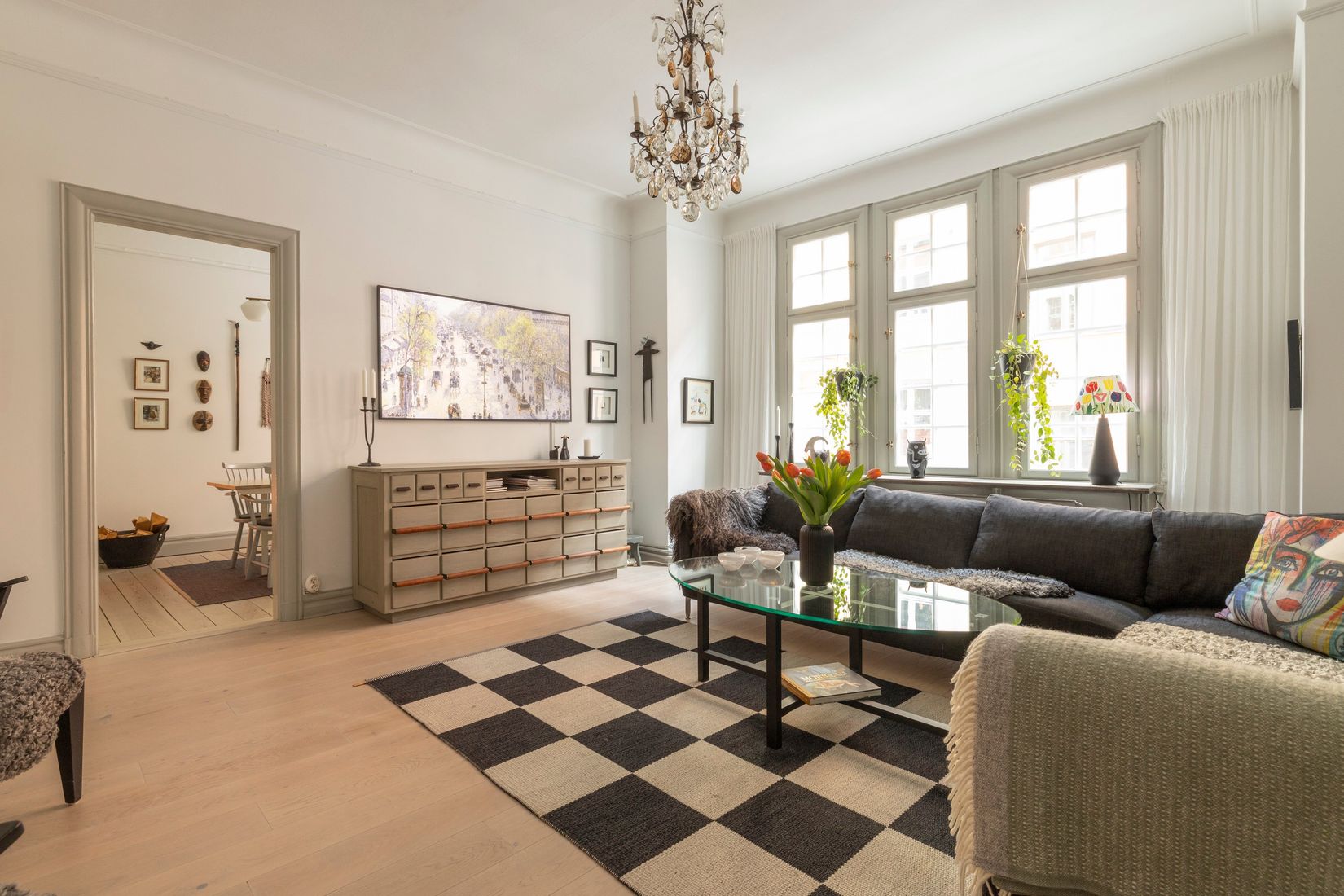 Vacker och välplanerad sekelskiftes-trea intill Mosebacke med flertalet bevarade originaldetaljer från byggåret 1909. Bostaden präglas av generös takhöjd, två fungerande kakelugnar, spröjsade fönster, tidstypiskt trägolv och balkong mot föreningens lummiga gård. De stora fönsterpartierna samspelar med takhöjden och skapar ett ljust och luftigt hem med en påtaglig känsla av rymd. En tidlös sekelskiftesbostad där ljus, rymd och bevarad originalcharm skapar en atmosfär utöver det vanliga. Redan i hallen möts man av en lugn värdighet och generös rymd. Planlösningen är genomtänkt och harmonisk, där varje rum får ta plats samtidigt som helheten upplevs självklar och balanserad. Köket är smakfullt utformat med noggrant utvalda material och högkvalitativa vitvaror. Här förenas estetik och funktion i en miljö som inbjuder till både stillsam vardag och sociala middagar. Arbetsytorna och den goda förvaringen samt ett rymligt skafferi bidrar till en känsla av omsorg i varje detalj. Bostadens sällskapsrum präglas av ljusets rörelse genom stora spröjsade fönster, medan matsalen utmärks av sitt vackra trägolv och en fungerande kakelugn som tillför både karaktär och värme. Rummen upplevs representativa men samtidigt ombonade och är lika väl lämpade för avkoppling som för umgänge. Planlösningens flexibilitet möjliggör även ett ytterligare sovrum för den som önskar. Sovrummet erbjuder rofylld avskildhet med god förvaring och direkt access till balkongen i västerläge, där kvällssolen möter den grönskande innergården i ett skyddat och stillsamt läge. I vardagsrummet förstärks känslan av rymd ytterligare, och möjligheten att installera en tredje kakelugn ger potential att återföra ännu mer av bostadens ursprungliga prakt. Detta är ett hem där sekelskiftets själ möter nutida komfort med självklar elegans och en bostad att trivas i under lång tid.