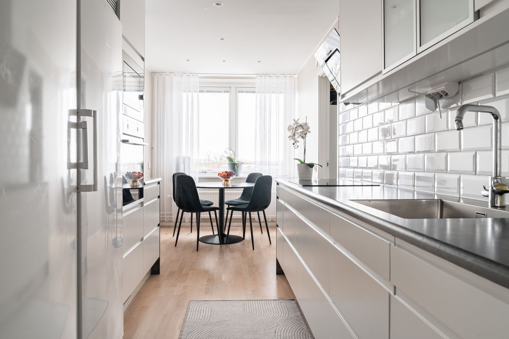 Välplanerad och stilren bostad med harmoniska färgval och smakfulla materialval som fortlöper i varje rum. Redan i hallen möts du av en inbjudande känsla med praktisk klinker, vacker träpanel och en naturlig övergång till varm parkett samt ljusa, tidlösa väggar som genomsyrar hemmet.