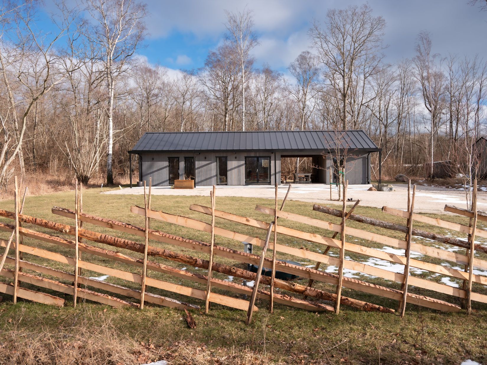 Huset är uppfört med genomtänkt planlösning där vardagsrum och kök ligger i öppen planlösning och skapar en social och ljus samlingspunkt. Tre sovrum och ett badrum finns i huvudbyggnaden. Genomgående slipade betonggolv med golvvärme ger ett enhetligt intryck och ett behagligt inomhusklimat året runt.