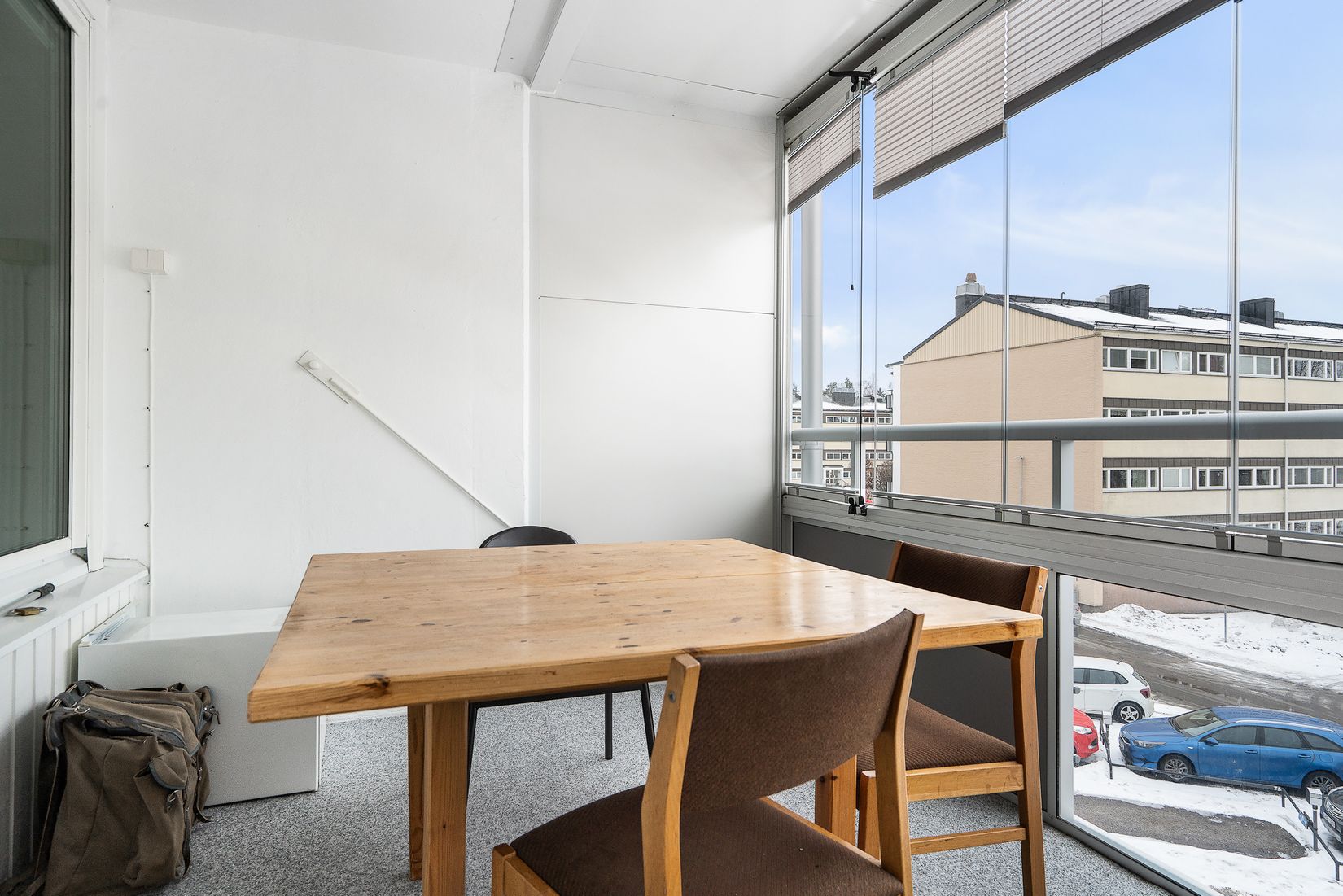 Rummet är lättmöblerat och rymmer både säng, soffa och matplats. Härifrån når du bostadens stora inglasade balkong – ett extra rum större delen av året! Njut av den fria utsikten och ett härligt ljusinsläpp som ger bostaden en luftig och öppen känsla.