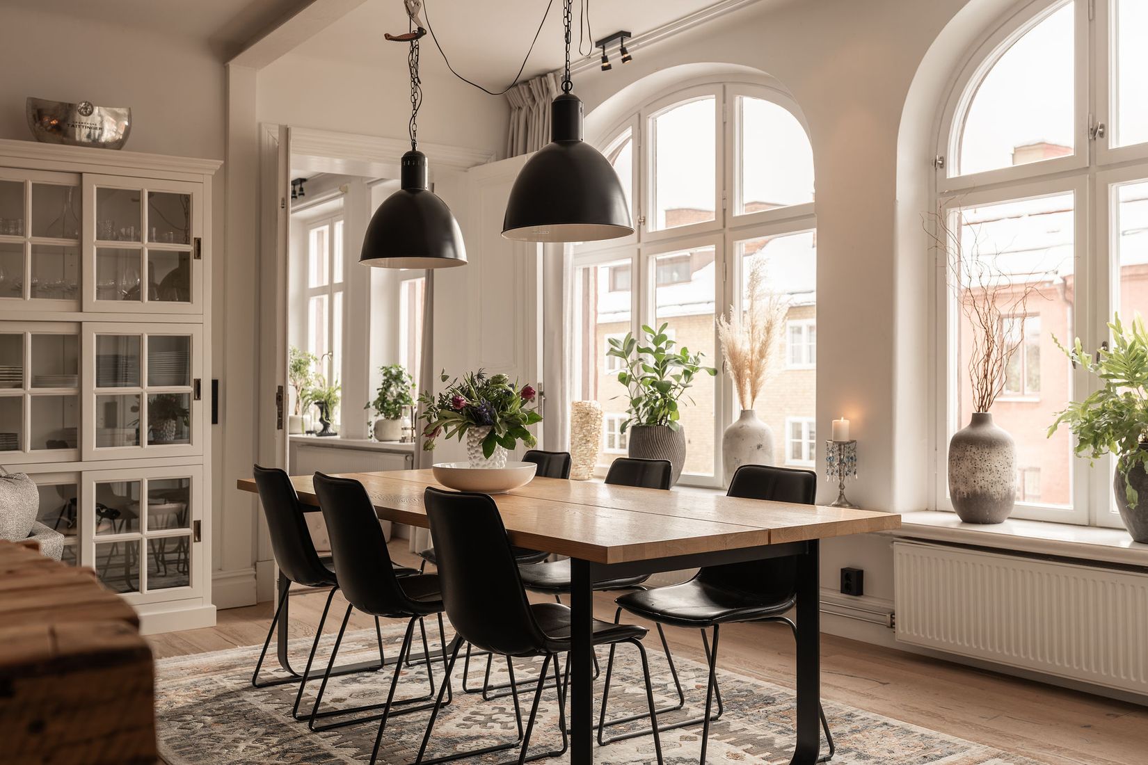Redan när du kliver in möts du av en atmosfär som andas rustik charm och elegans. De stora välvade fönstren som släpper in ljus ger bostaden en fantastisk rymd och skapar ett levande ljusspel genom hela hemmet. Tillsammans med högt i tak förstärks känslan av volym och exklusivitet – här får varje rum en luftig och inbjudande karaktär.