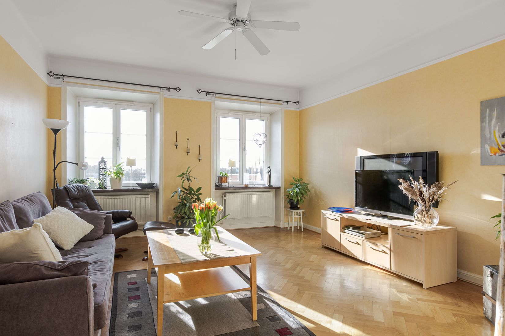 Bostaden är belägen i ett vackert hus från 1929 och bjuder på en imponerande takhöjd som tillsammans med stora, eleganta fönster skapar en härlig rymd och ett fantastiskt ljusinsläpp. Vardagsrummet är hemmets naturliga samlingsplats med vacker fiskbensparkett och gott om plats för en större soffgrupp- en perfekt miljö för både vardag och fest.