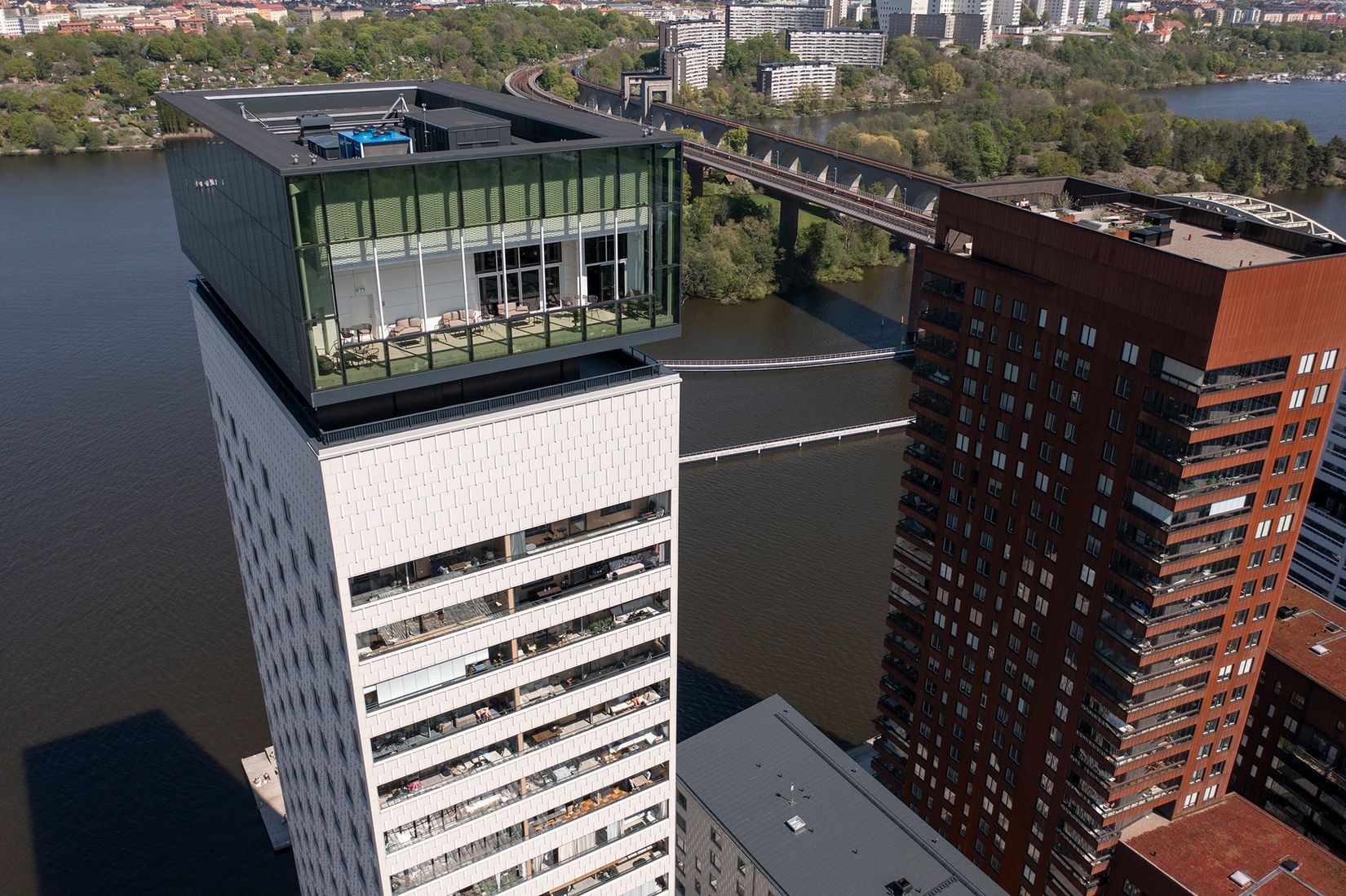 Den karaktäristiska byggnaden stoltserar med förstaplatsen i Årets Stockholmsbyggnad 2022. Populär bostadsrättsförening som erbjuder inglasad restaurang högst upp i höghuset för härliga matupplevelser och panoramautsikt över Stockholm. Föreningen har dessutom garageplatser, gemensam uteplats samt en gästlägenhet högst upp i högdelen. Dessutom får du billigare hemförsäkring genom att föreningen redan kollektivt tecknat bostadsrättstillägg för sina medlemmar. Föreningen har amorterat extra utöver ekonomisk planen, men kommer gå tillbaka till en lägre amorteringstakt för att bygga upp en större kassa för att klara högre räntor framåt. Lugnt attraktivt läge där ni lever i en unik marin boendemiljö vid Liljeholmskajen.
