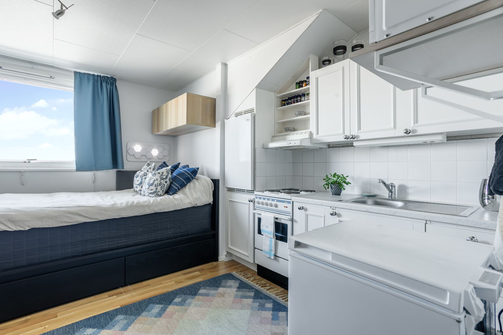 Bostaden disponeras med ett ljust och lättmöblerat allrum med plats för både säng och matplats. Det generösa ljusinsläppet i kombination med utsikten skapar en luftig och trivsam atmosfär som är svår att inte förälska sig i. Här finns även en garderob som erbjuder praktisk förvaring utan att kompromissa med rymden. I anslutning till allrummet ligger köket, funktionellt utformat med goda arbetsytor som väl tillgodoser vardagens behov. För den som önskar finns möjlighet att överta delar av möblemanget, vilket ger en smidig och bekväm inflytt.