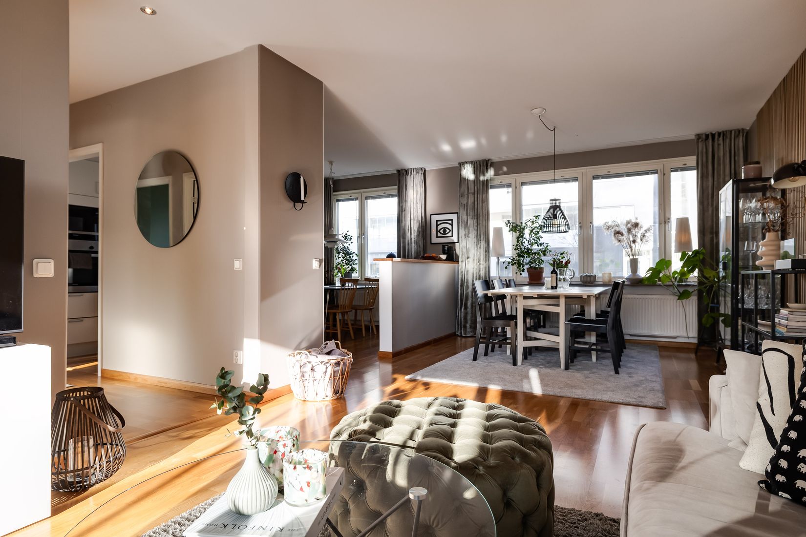 Bostadens hjärta är den stora, öppna och sociala ytan mellan kök och vardagsrum – en inbjudande plats för både vardagsliv och festliga tillställningar. Här flödar ljuset och skapar en luftig atmosfär där familj och vänner naturligt samlas.