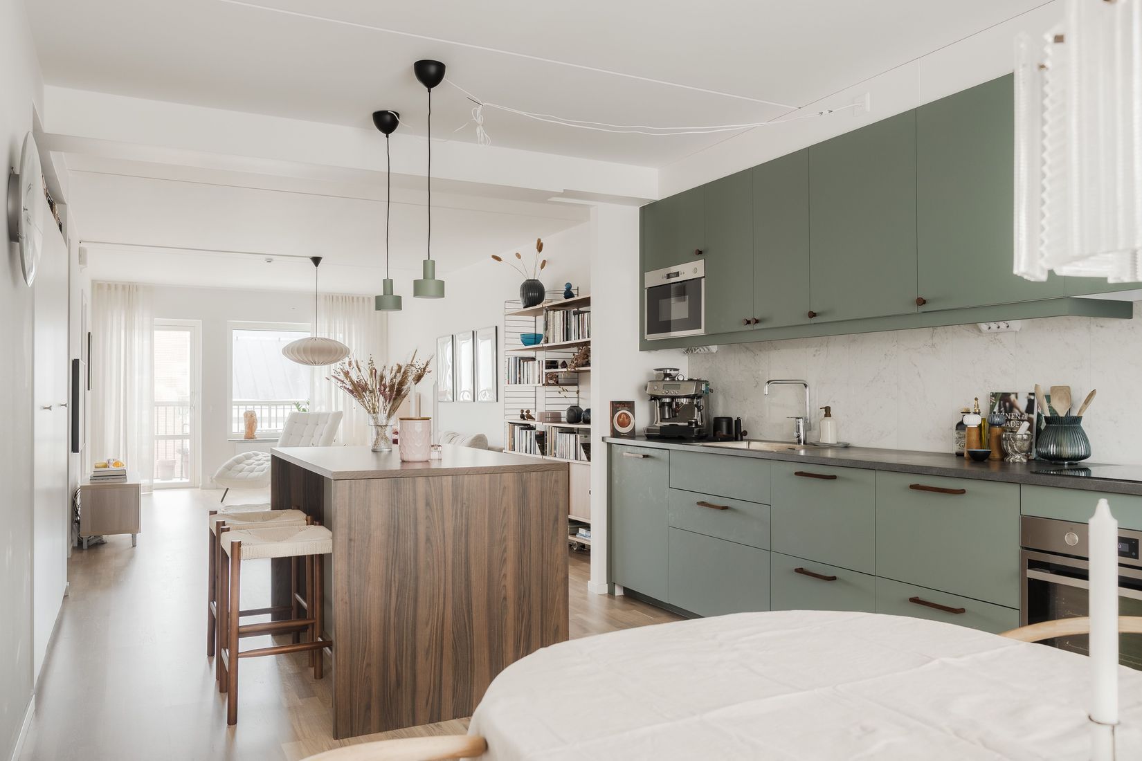 Känslan av nytt i lägenheten är påtaglig, liksom den ombonade känslan som fås genom fina accenter i dämpade toner. Köksinredningen sticker ut med sina gröna luckor och inslag av mörkt trä. Nyanser av både grått och beige förekommer även på interiör i badrum och på väggarna i ett av sovrummen.