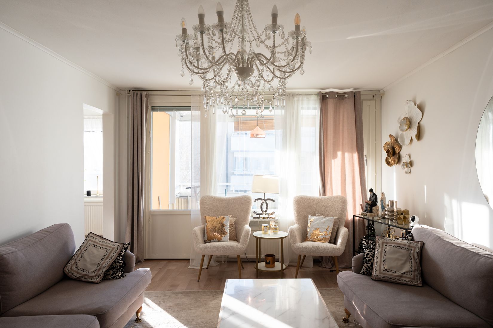 Vardagsrummet är generöst tilltaget och här finns bostadens riktiga blickfång: en ny dekorvägg i sten med infällda spotlights som ger rummet karaktär och en exklusiv känsla. Härifrån nås även den inglasade balkongen, ett extra rum som kan nyttjas stora delar av året – idealisk för morgonkaffet eller en lugn stund på kvällen.