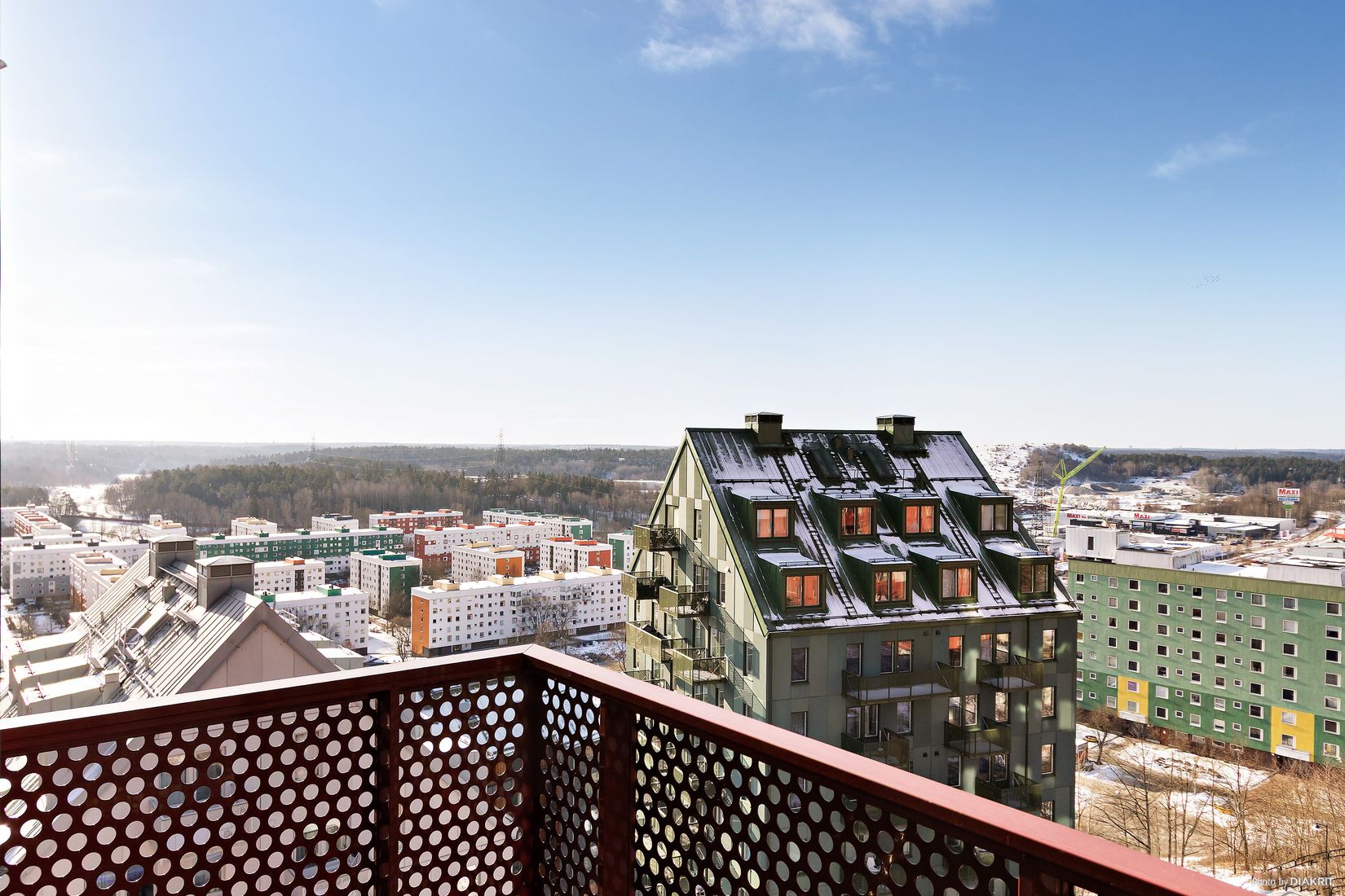 Balkongen är rymlig och blir en självklar plats för avkoppling. Tack vare bostadens höga läge får du en fri utsikt, rikligt med ljusinsläpp och en vy att njuta av året runt.