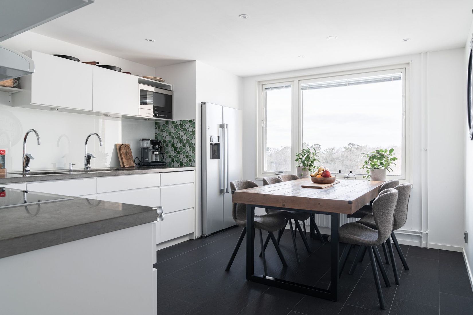 I hallen möts du av en inbjudande entré med bra förvaringsmöjligheter och stilrena ytskikt. Köket är funktionellt och modernt med goda arbetsytor och plats för matgrupp vid fönster, perfekt för både vardagsmåltider och trevliga middagar.