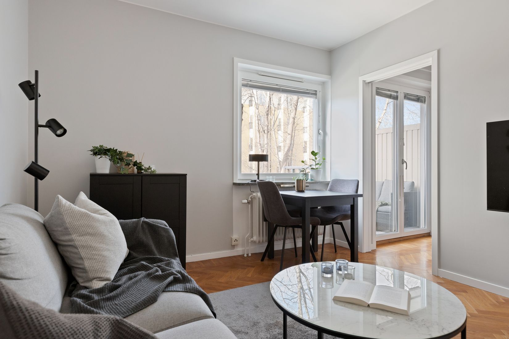 På en lugn återvändsgata med grönska precis runt husknuten hittar ni denna nyrenoverade bostad! I bostaden möts ni av ett fantastiskt ljus tack vare stora fönsterpartier i vardagsrummet. I hallen möts ni av en vacker tapet i taket - här finns plats för hatthylla samt ingång till den praktiska klädkammaren. Det nyligen renoverade köket går i en sober grön kulör och är utrustat med induktionshäll, kombinerad varmluftsugn med microfunktion, fläkt samt kyl- och frys. Vidare till vardagsrummet - på golvet ligger ett fantastiskt fint fiskbensparkett och väggarna går i ljus kulör. Här möblerar ni med enkelhet soffgrupp och matgrupp. Mellan sovrum och vardagsrum finns en praktisk sjuktdörr som ger rummen maximal yta. Sovrummet ger plats för säng och tillhörande sängbord, härifrån tar ni klivet ut på den mysiga balkongen. Balkongen är belägen i ett härligt västläge med en grönskande utsikt. Ett ljust och fräscht helkaklat badrum utrustat med dusch, kommod, handdukstork samt wc. I bostaden finner ni två rymliga klädkammare och till bostaden tillhör även ett vindsförråd samt ett källarförråd.