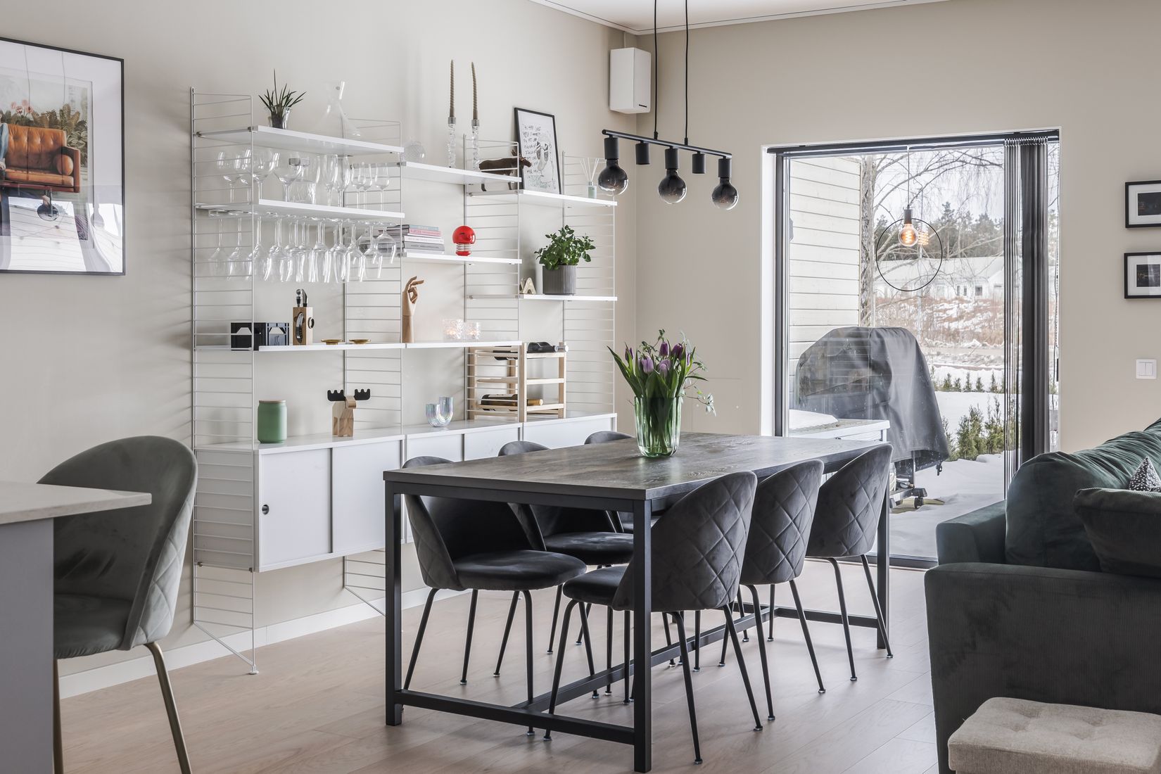 Boendet har en genomtänkt planlösning som passar den moderna familjen. Entréplanet inrymmer husets sociala ytor med vardagsrum och kök i öppen planlösning. Det fullutrustade köket är från HTH med gråa luckor, rikligt med arbetsyta tack vare den stora bänkskivan av sten. Trevlig köksö som sammankopplas med vardagsrummet. Vidare in på entréplan finner du det väl tilltagna vardagsrummet med stora fönsterpartier ut mot bostadens uteplats och trädgård, detta ger en ljus och härlig känsla. Stilrent duschrum i grå kulör, egen tvättavdelning med TM & TT. Klädkammare under trappen. Entréplan har vattenburen golvvärme. På övre plan finner du hela fyra sovrum, ett mysigt allrum perfekt för barnens häng och du finner ytterligare ett stilrent badrum.