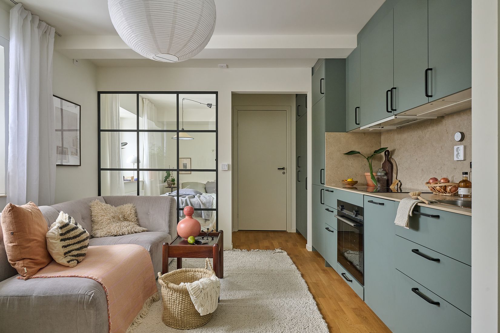Sovrummet ramas in av en stilren industriglasvägg som både avgränsar och släpper igenom ljus. En praktisk och snygg lösning som ger hemmet karaktär utan att ta över. Här får du ett boende som är lätt att trivas i, med både modern komfort och ett stilla gårdsläge.