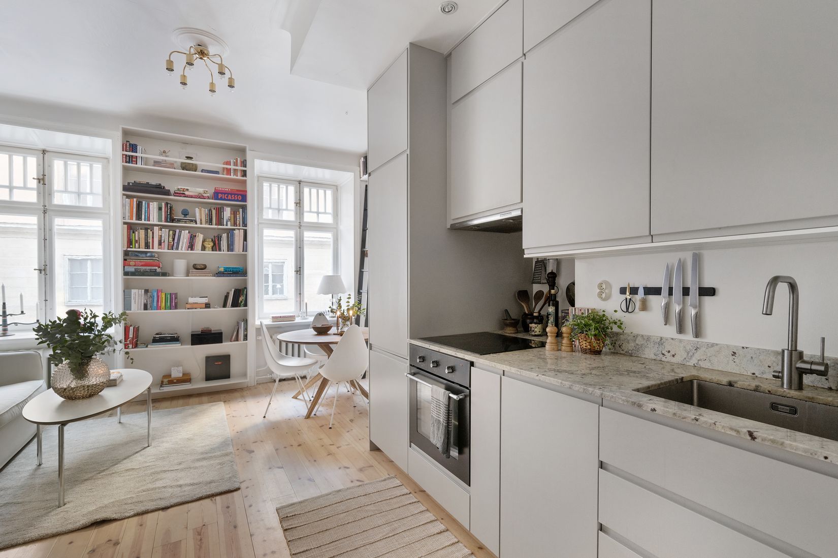 Förvaringen är genomtänkt med platsbyggda och skräddarsydda lösningar. Den integrerade loftlösningen tar vara på takhöjden och skapar en naturlig uppdelning mellan sällskapsdel och sovdel - ett elegant exempel på compact living där form och funktion samverkar. Praktisk förvaring finns i inbyggda garderober och till lägenheten hör även ett ovanligt rymligt källarförråd.