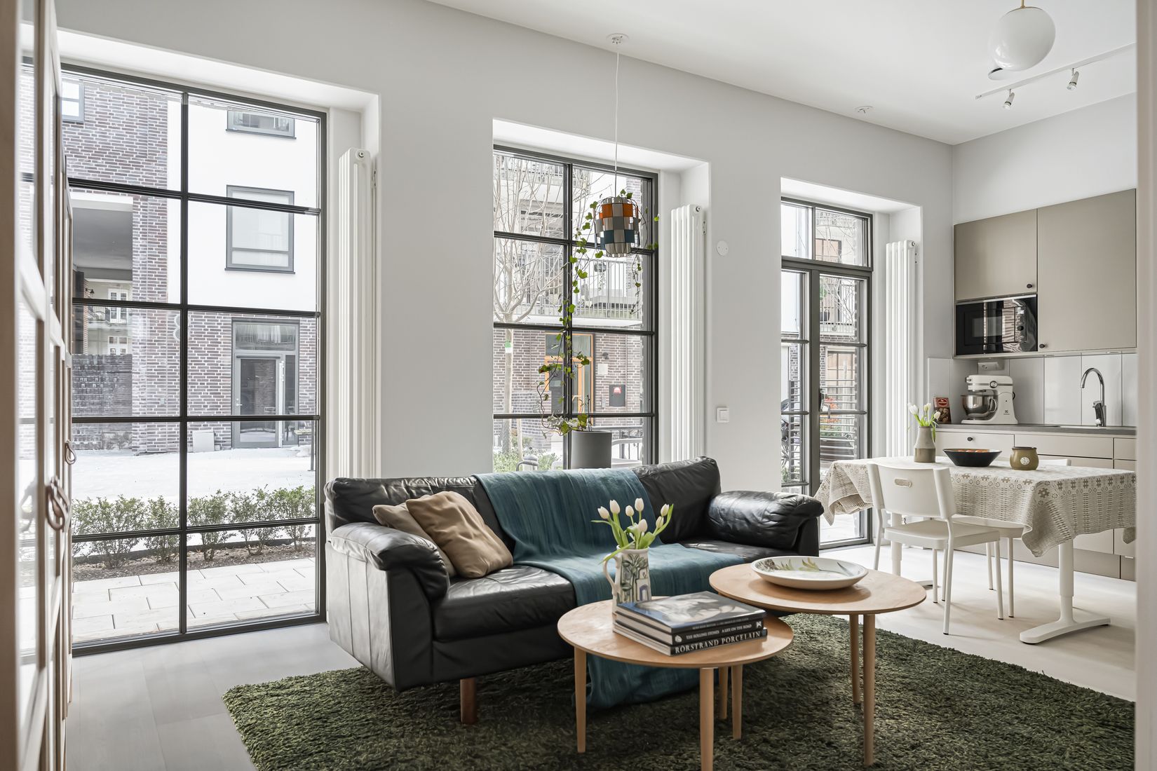 Det ljusa vardagsrummet utgör hemmets naturliga samlingspunkt med generösa fönsterpartier från golv till tak som skapar ett härligt ljusinsläpp och en luftig känsla. Härifrån nås bostadens uteplats som vetter mot föreningens trivsamma gårdsmiljö – en perfekt plats för morgonkaffet eller en stunds avkoppling. Vardagsrum och kök samspelar i en öppen och social planlösning som bjuder in till både middagar och umgänge. Det stilrena köket från Vedum harmonierar fint med det ljusa askparkettgolvet, som skapar en elegant kontrast till de stora fönsterpartierna med industriell karaktär.