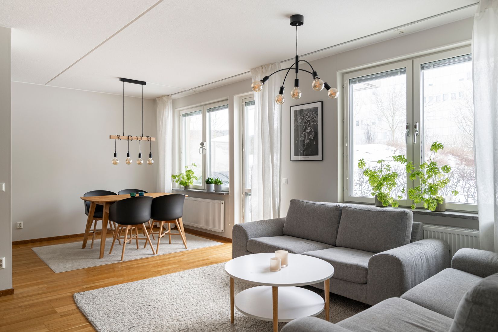 Det rymliga vardagsrummet erbjuder gott om plats för både soffgrupp och matplats och binds samman med bostadens stilrena kök. Köket är välplanerat med generösa arbetsytor, bra förvaringsmöjligheter och komplett maskinell utrustning - idealiskt för både vardagsmatlagning och middagar med gäster.