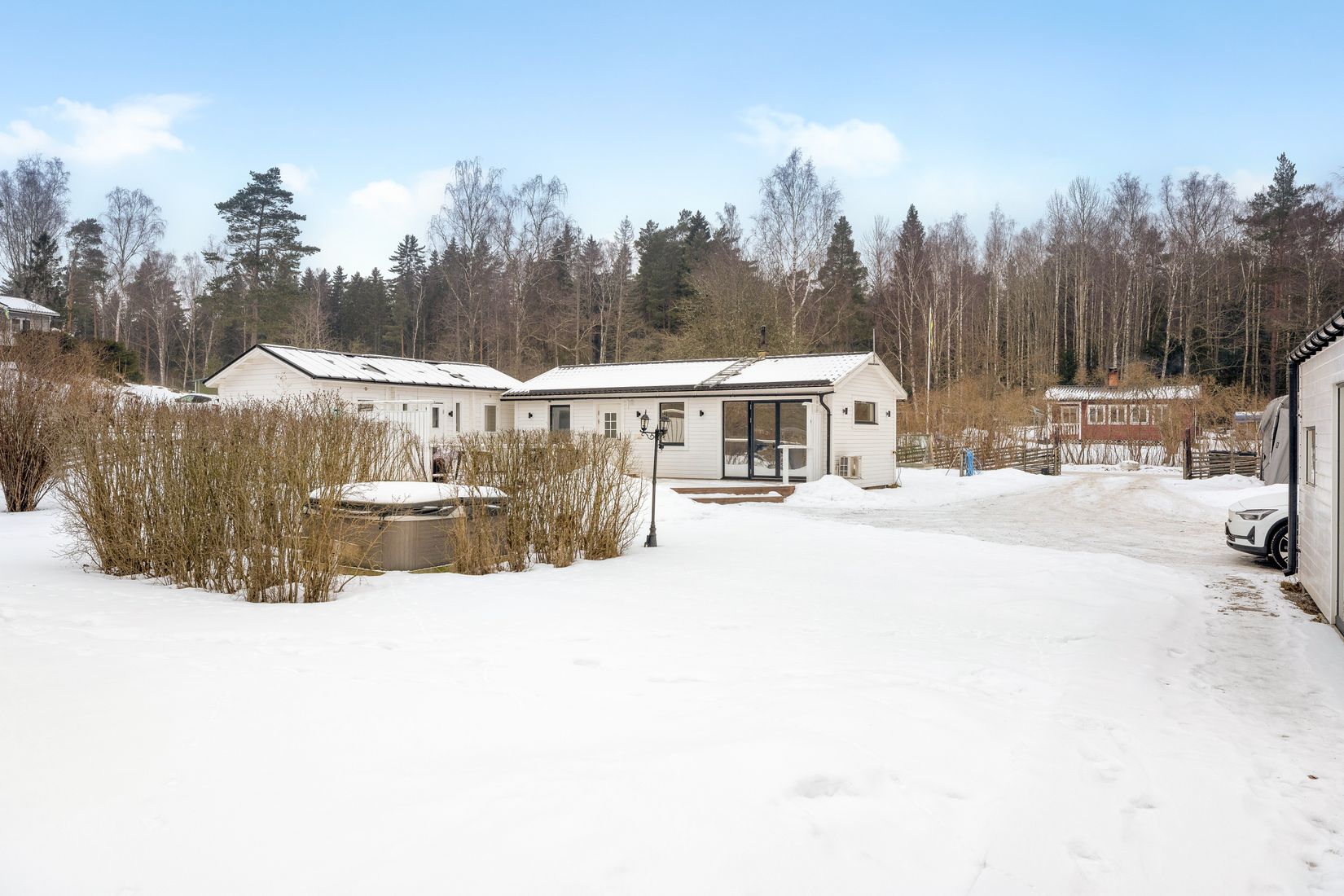 Den breda uppfarten erbjuder gott om plats för flera bilar, släp och även husbil – praktiskt och bekvämt för både vardag och fritid.