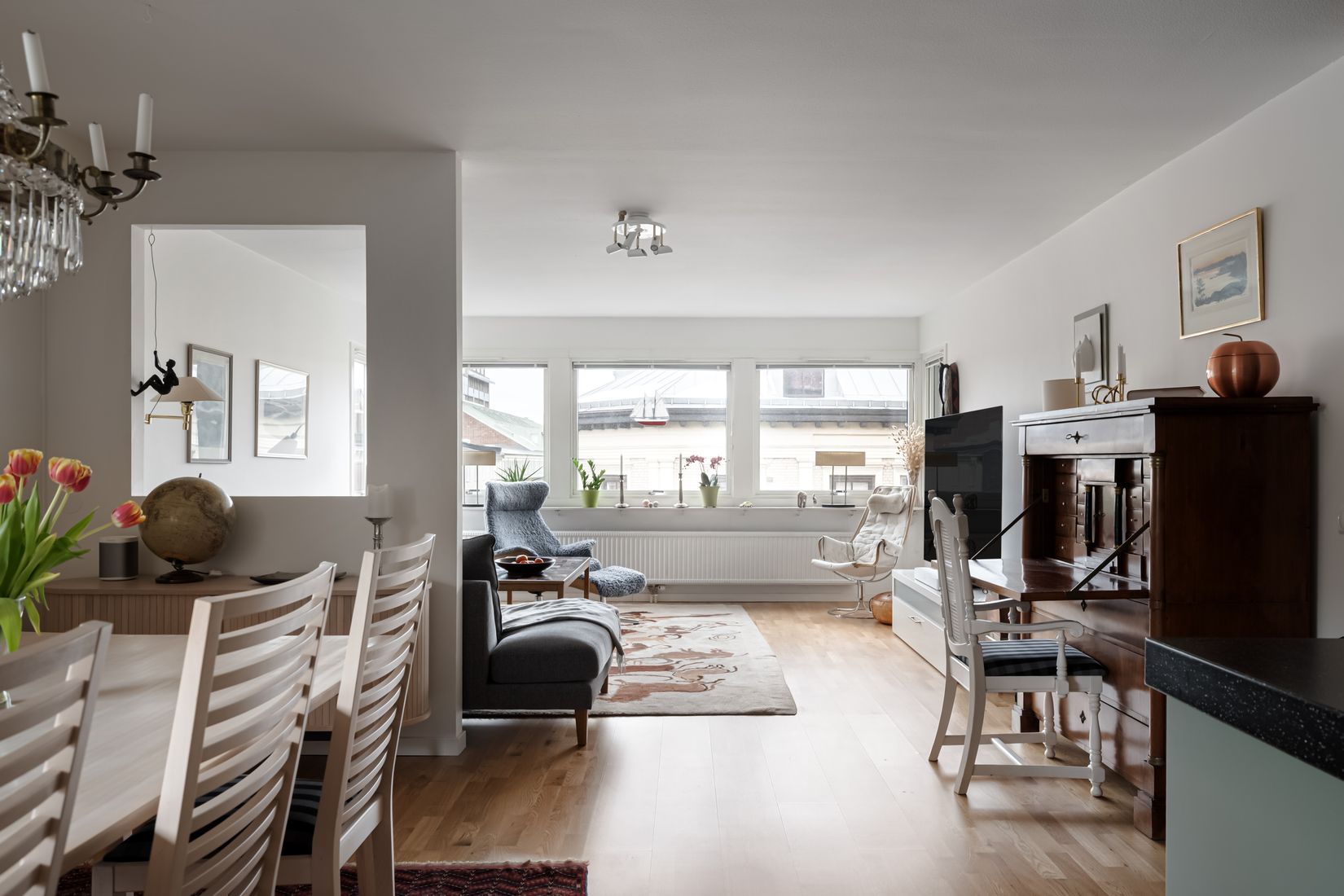 Bostadens hjärta är den öppna planlösningen mellan kök och vardagsrum, där en generös köksö blir en naturlig samlingsplats för både vardag och fest. Köket är smakfullt renoverat med finess och erbjuder gott om förvaring samt fina arbetsytor. Vardagsrummet är luftigt och inbjudande, med stora fönsterpartier som släpper in rikligt med ljus och bjuder på en fantastisk utsikt över Linnéstadens vackra takåsar och karaktäristiska tegelfasader – en vy att njuta av året om, såväl inomhus som ute på den stillsamma balkongen.