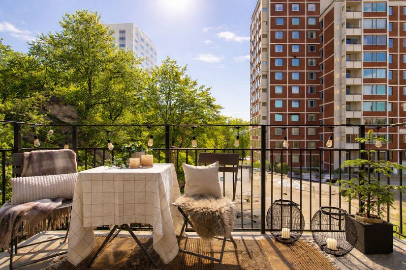 Man har även nyttjanderätt till ett källarförråd och ett mindre potatiskällare. - Sommarbilder på balkongen är ai-redigerade för att visa hur det ungefär ser ut på sommaren.
