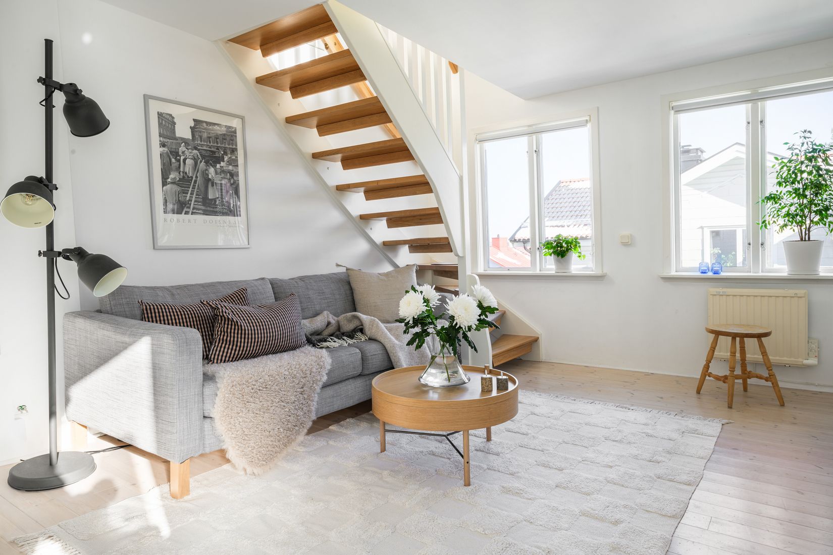 Här möts ni av ett hem som kombinerar stilren design med moderna materialval och en välplanerad etagelösning. Ljusa ytskikt, fint ljusinsläpp och genomgående vitlaserat furugolv skapar en inbjudande och harmonisk atmosfär. Tillsammans med charmiga detaljer och genomtänkta renoveringar erbjuds ett hem med både karaktär och funktion. Entréplanet välkomnar er med ett kök och vardagsrum i en öppen planlösning som ger ett generöst ljusflöde. Köket renoverades 2023 och har stilren inredning från HTH i ljus kulör. Här njuter ni av fint ljusinsläpp och rogivande grönska utanför fönstret. Vardagsrummet erbjuder plats för både soffgrupp och matbord – en social och trivsam yta för såväl vardag som fest.
