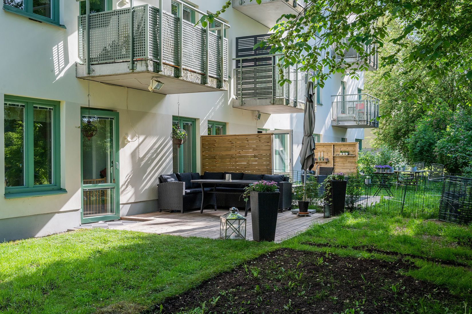 Här har du en fantastisk uteplats som dessutom blickar ut med fri sikt mot Storängsparken. Perfekt för dig som gillar att odla, sola eller bara njuta av sena sommarkvällar.
