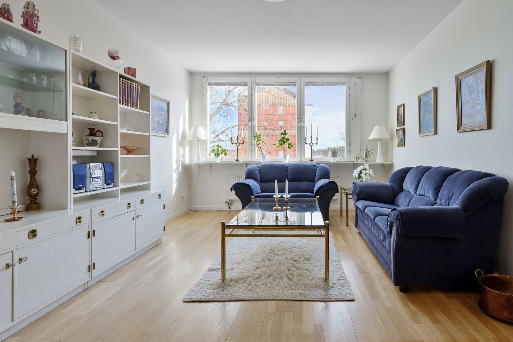 Vardagsrummet är stort och ljust med generösa fönsterpartier som släpper in rikligt med dagsljus. Här finns gott om plats för både soffgrupp och matsalsmöbel om så önskas. Bostaden erbjuder två sovrum i bra storlek – ett rymligt med plats för dubbelsäng och garderober för god förvaring samt ett något mindre som passar utmärkt som barnrum, gästrum eller hemmakontor.