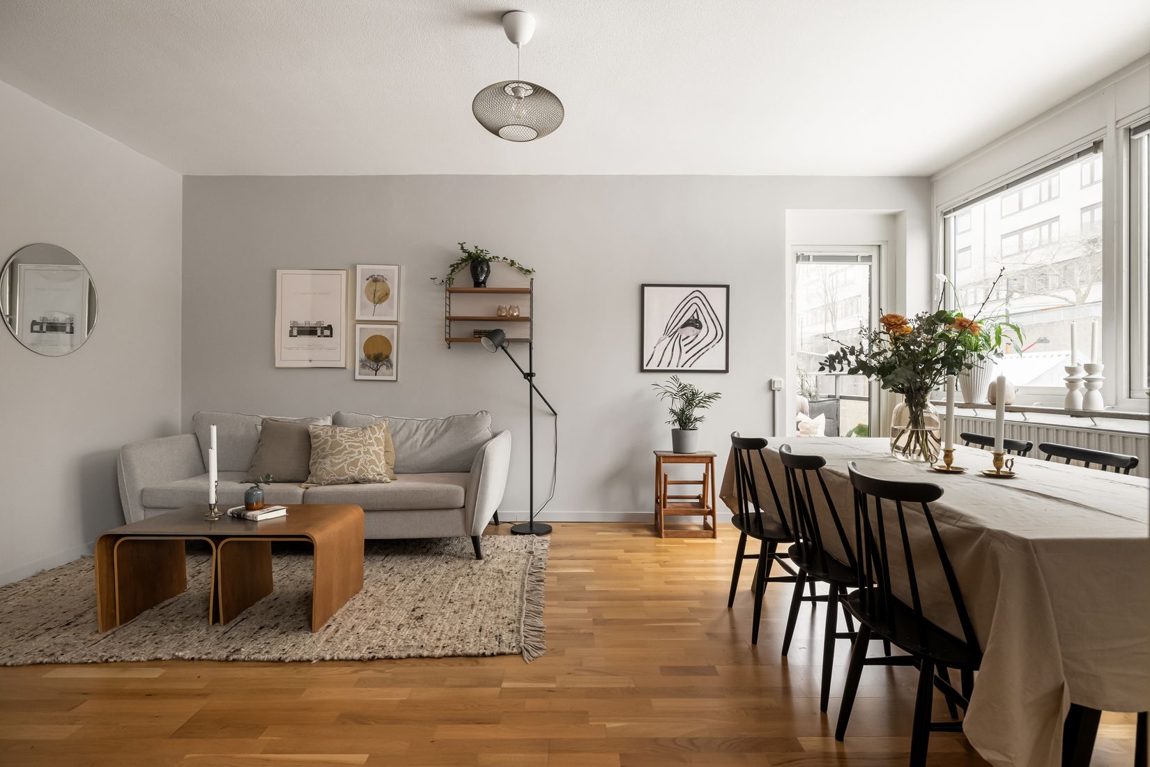 Lägenheten erbjuder en smart och välplanerad planlösning med tydligt avgränsade rum. Det stora vardagsrummet är lättmöblerat och rymmer både soffgrupp och en rejäl matgrupp för dig som gärna bjuder hem vänner och familj. De generösa fönsterpartierna skapar ett fantastiskt ljusinsläpp och förstärker känslan av rymd. Härifrån nås den soliga balkongen i västerläge – en perfekt plats att njuta av eftermiddag och kvällssol.