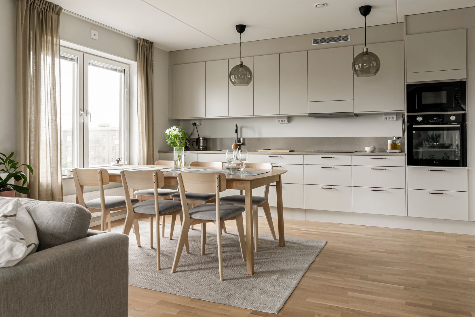 Här bor du i en ljus och genomtänkt lägenhet där den öppna planlösningen skapar ett fint och naturligt samband mellan kök och vardagsrum. Ytorna hänger ihop på ett sätt som gör att hemmet känns både rymligt och ombonat. Du lagar mat i det stilrena Marbodalköket samtidigt som du är en del av samtalet runt bordet. Gott om förvaring, integrerade vitvaror och en vinkyl gör vardagen smidig och middagarna extra trevliga.