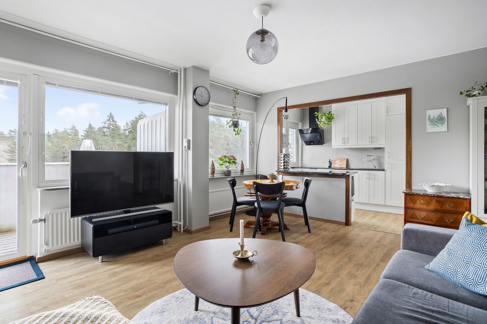 Bostaden erbjuder en genomtänkt planlösning med generösa ljusinsläpp och välutnyttjade kvadratmeter. Vardagsrummet är luftigt och lättmöblerat med plats för både soffgrupp och matplats. Härifrån nås den stora balkongen som vetter mot grönska och natur – en privat oas för morgonkaffet eller avkoppling i solen, helt utan störande insyn.