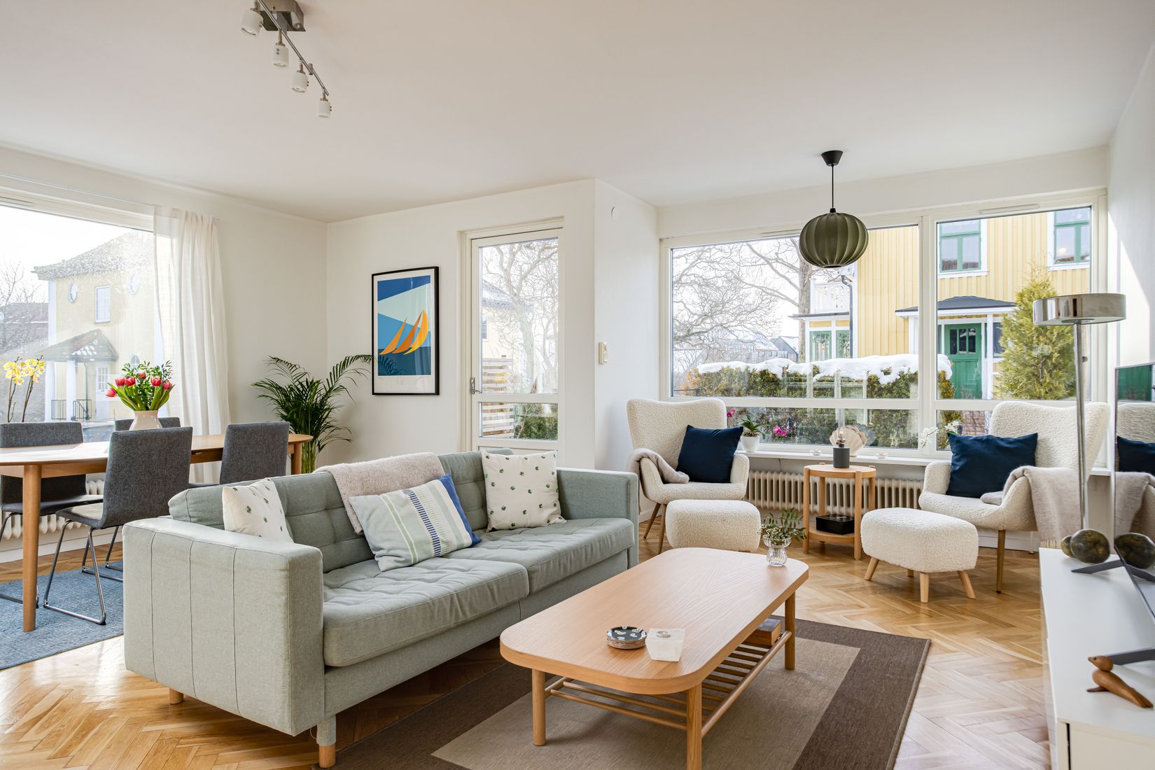 Vardagsrummet är en självklar samlingspunkt med sin charmiga fiskbensparkett, stort ljusinsläpp och en atmosfär som gör det enkelt att trivas. Köket ligger i fil och knyter samman vardagets flöden på ett sätt som både känns praktiskt och hemtrevligt. De tre sovrummen rymmer allt från de första småbarnsåren till tonårsrum, gästrum eller hemmakontor.