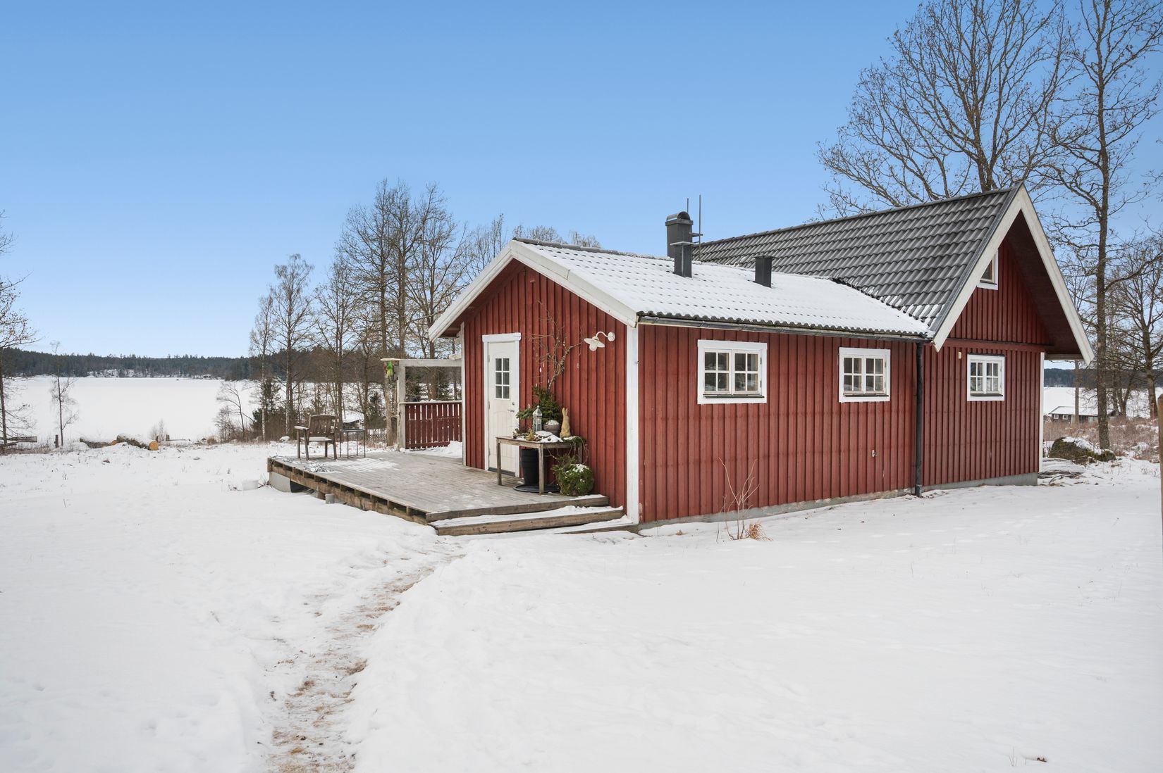 Från den väl tilltagna altanen njuter du av en härlig utsikt över sjön – en självklar plats för morgonkaffet, långa sommarkvällar och avkoppling i solnedgången.