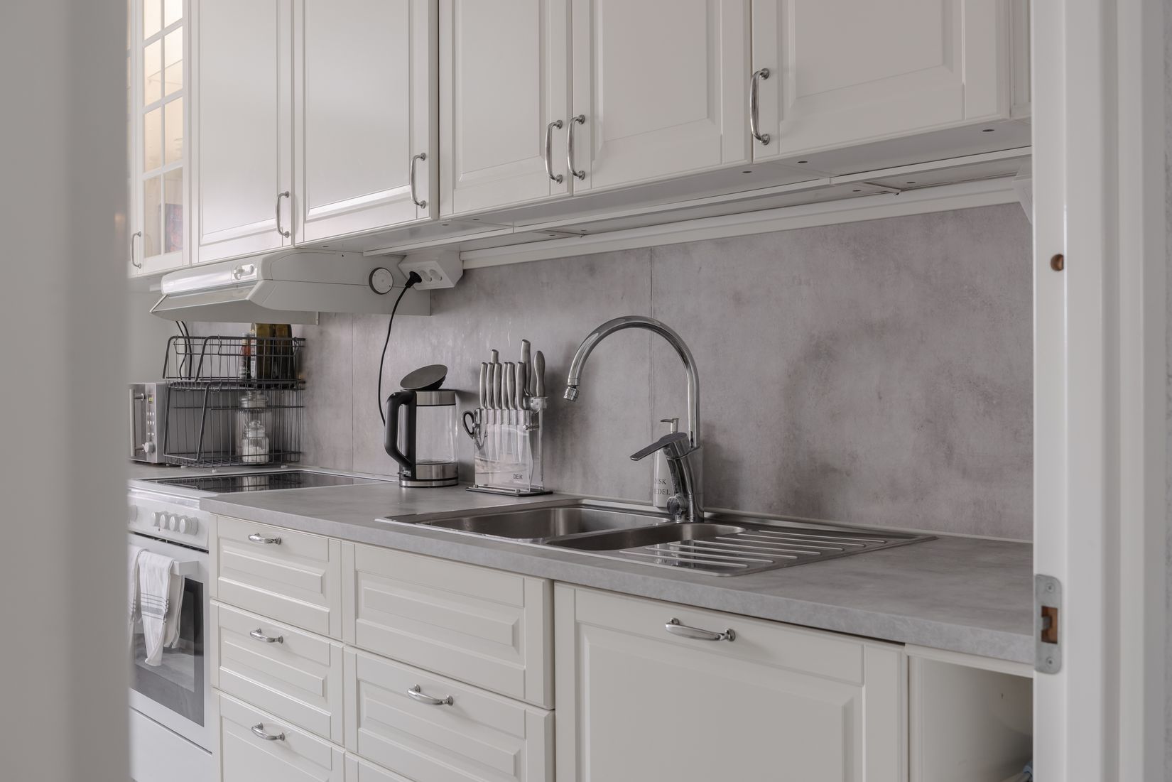 Köket är smakfullt inrett i creamvitt från IKEA med ljusgrå bänkskiva som även löper upp på väggen och skapar ett enhetligt intryck. Ljusgrå mönstrad tapet, vit bröstpanel och full maskinell utrustning inklusive diskmaskin gör köket både funktionellt och trivsamt.