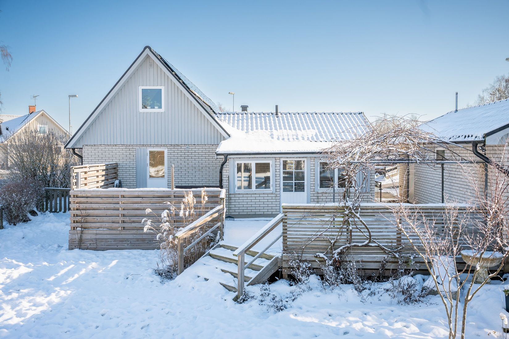 Tomten är en grönskande oas med riklig växtlighet och blomning under säsong. På framsidans uteplats avnjuts sommarens första kaffe i morgonsolen. Under dagen och kvällen flyttar livet vidare till baksidans generösa trädäck med flera zoner varav en med utespa för avkopplande stunder året om. Här sitter du gärna under vinrankan som breder ut sig som ett naturligt tak över delar av altanen. Från trädäcket nås den stora, inhägnade gräsmattan som bjuder in till lek och spring samt ett litet växthus för den odlingsintresserade.