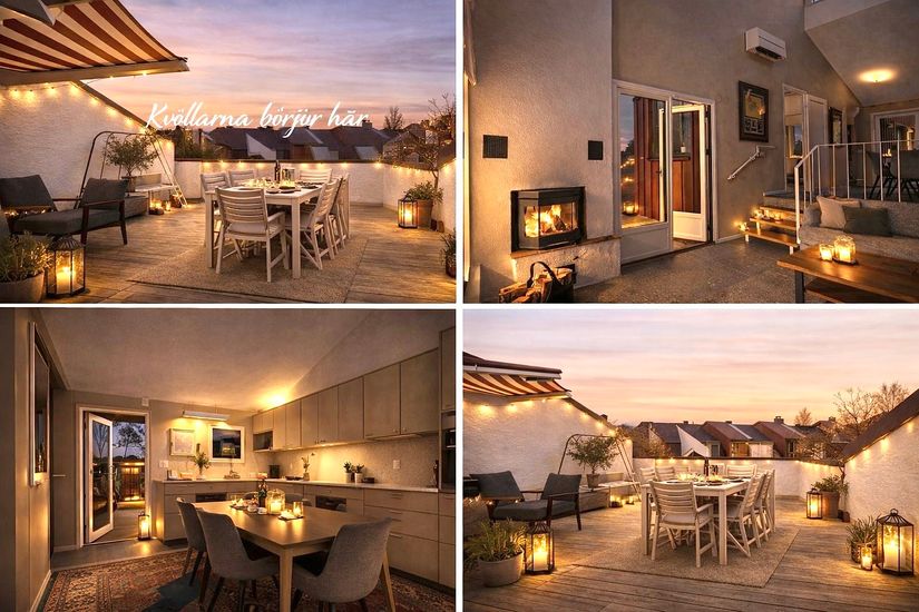 Den större uteplatsen i sydvästläge har gott om plats för såväl middagsbjudningar som loungeliv och när ljusslingor och lyktor tänds skapas en miljö som för tankarna till sydligare breddgrader. Med en tomtgräns som slutar 6-7 meter utanför den nuvarande muren finns möjlighet att göra uteplatsen större och kanske anlägga en mindre pool eller varför inte ett uterum. Entrésidans uteplats erbjuder även den plats för såväl lite mindre matplats som loungesoffa eller liknande möblemang efter behov och önskemål. Förvaringsutrymme i förråd samt biluppfart med laddplats.