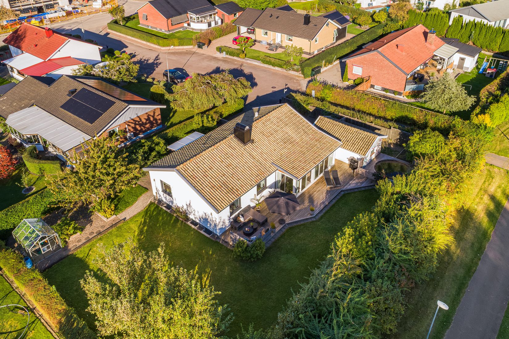 Med en total yta om hela 200 kvm (100 kvm boarea och 100 kvm biarea, inredd källare) erbjuds här gott om plats för både familjeliv och sociala tillställningar. Villan är belägen som sista huset på en lugn återvändsgata, vilket ger ett ostört och tryggt läge. Den soliga trädgården i söderläge vetter mot grönområde och bjuder på sol hela dagen, en perfekt plats för både avkoppling och lek.