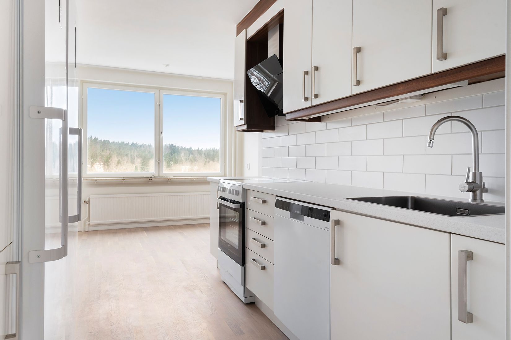 Det rymliga köket erbjuder goda arbetsytor, bra förvaring och en naturlig matplats vid fönster.