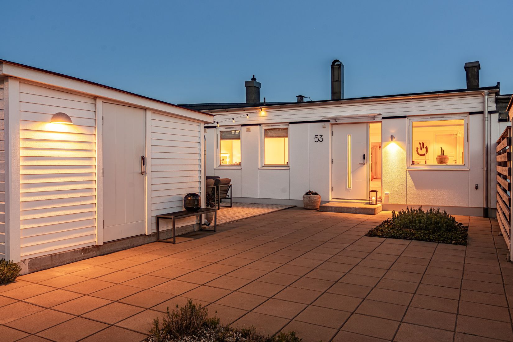 Medan barnen leker kan ni laga mat och hålla ett vakande öga men även mingla med gäster, tack vare den öppna planlösningen som samspelar med sällskapsrum. Gränserna mellan ute- och inomhusmiljö suddas ut tack vare de enorma fönsterpartierna! Ljusflödet är obeskrivligt vackert! På tal om utomhusmiljön - insynsskyddad plats i rakt söderläge. Orkar du inte ta den lilla promenaden ner till havet så kan du lika gärna jobba in D-vitamin på baksidan!