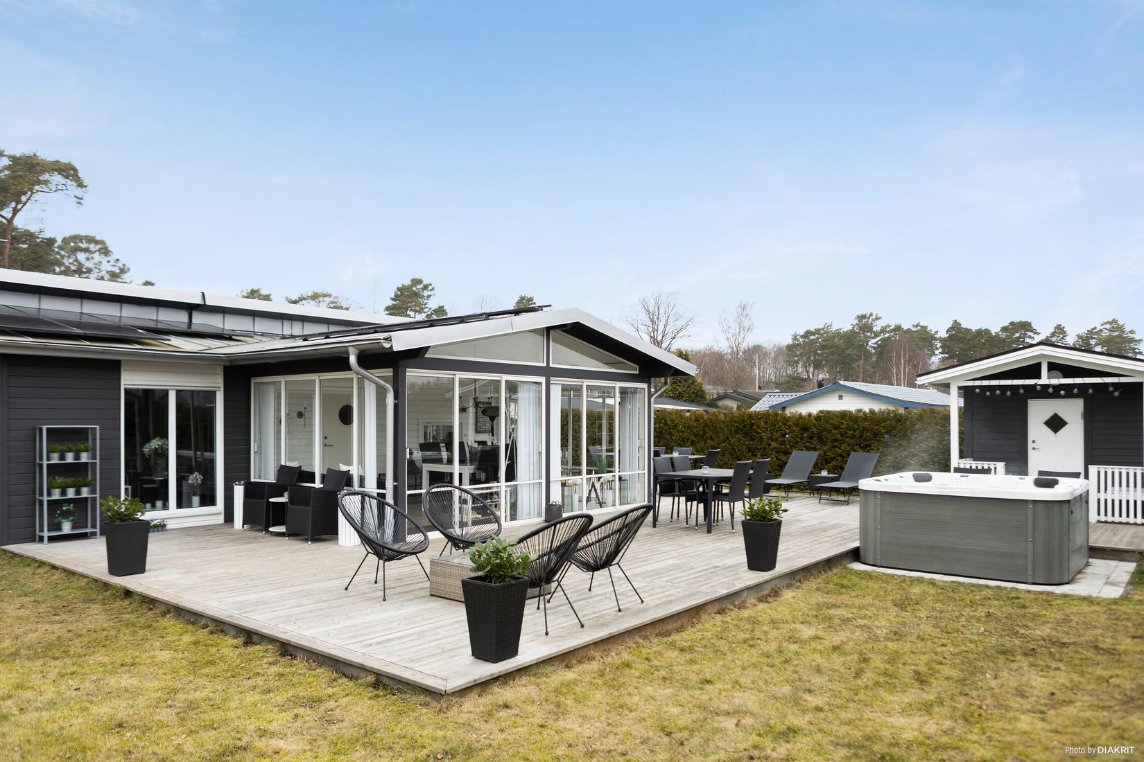 Hög standard med bandtäkt pulpetttak, inglasat uterum, vardagsrum med kamin, fräscht kök och stort trädäck med spabad.