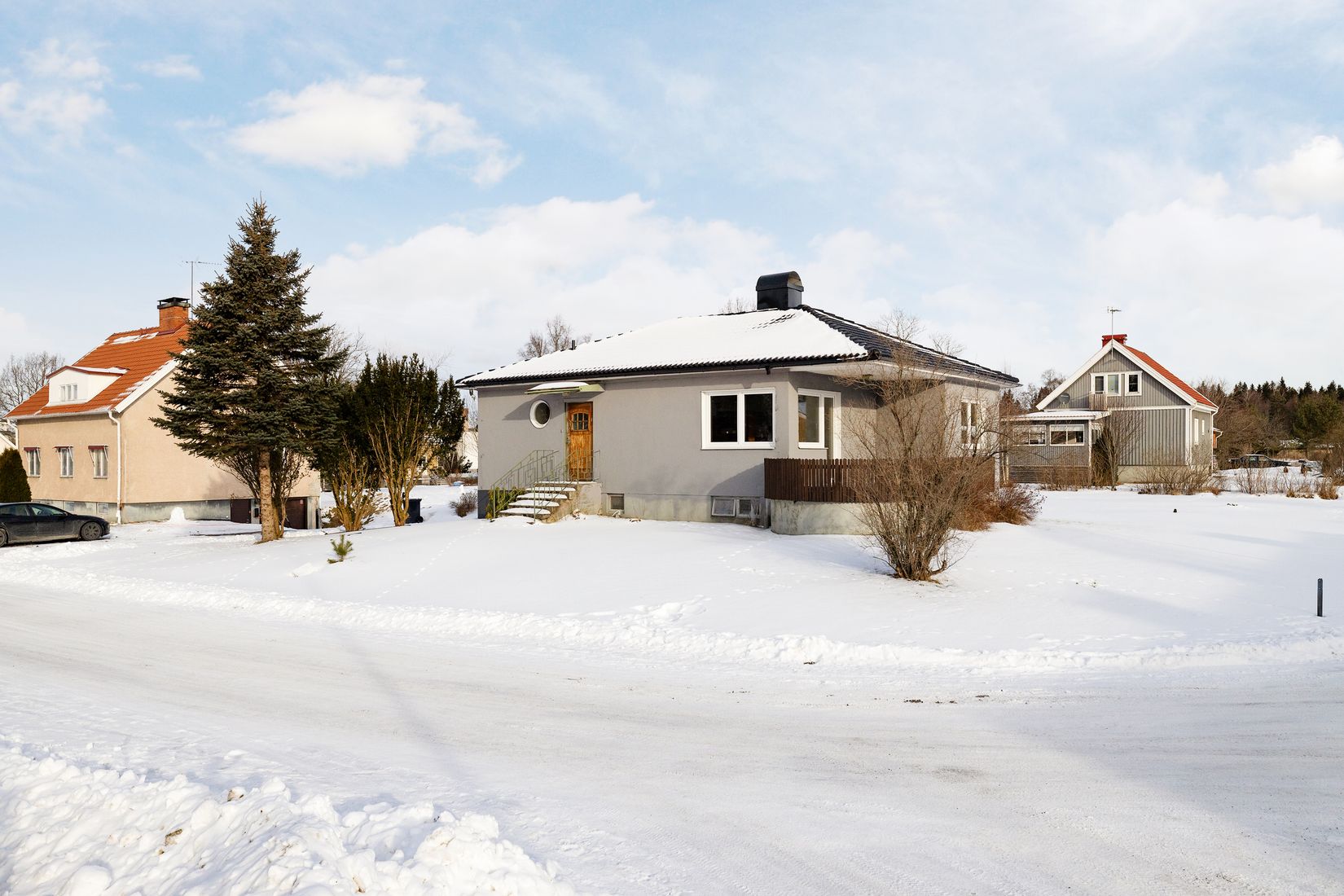 Huset har en stilren ljus fasad som tillsammans med det mörka taket skapar ett tidlöst och välskött intryck. Den upphöjda entrén nås via trappan med smidesräcke och ger ett trevligt första välkomnande. På framsidan breder den generösa tomten ut sig och ramas in av grönska och uppvuxna träd som ger både karaktär och insynsskydd. Den stora gräsmattan erbjuder gott om plats för lek och trädgårdsliv och läget på hörntomt ger en luftig och öppen känsla.