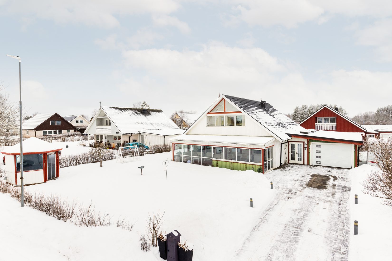 Utomhus är finns en trevlig stensättning från gatan till huset och på uppfarten finns gott om plats för flera bilar samt ett garage md elport och motorvärmare. Den trevliga trädgårdstomten erbjuder fina gräsytor som lämpar sig väl för lek och spel. Här finns även två förråd och lusthus med grillplats.