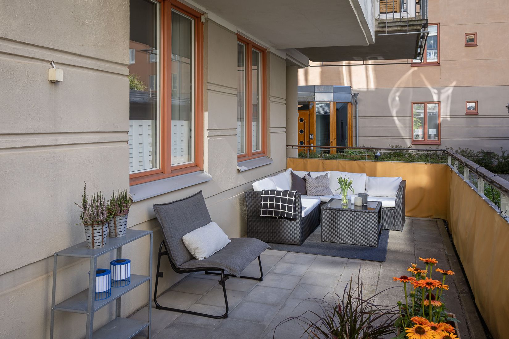Lägenheten är ljus och erbjuder en mycket stor plattsatt uteplats mot en fin och lugn innergård. Uteplatsen har ett mycket trevligt västerläge och detta är en unik möjlighet. Lägenheten om 40 kvm har en mycket bra planlösning. Bostaden erbjuder en klädkammare samt ett stort helkaklat badrum med bl.a. egen tvättmaskin. Köket är fullutrustat och har en öppen planlösning mot vardagsrummet med gott om plats för säng, matbord och soffgrupp.