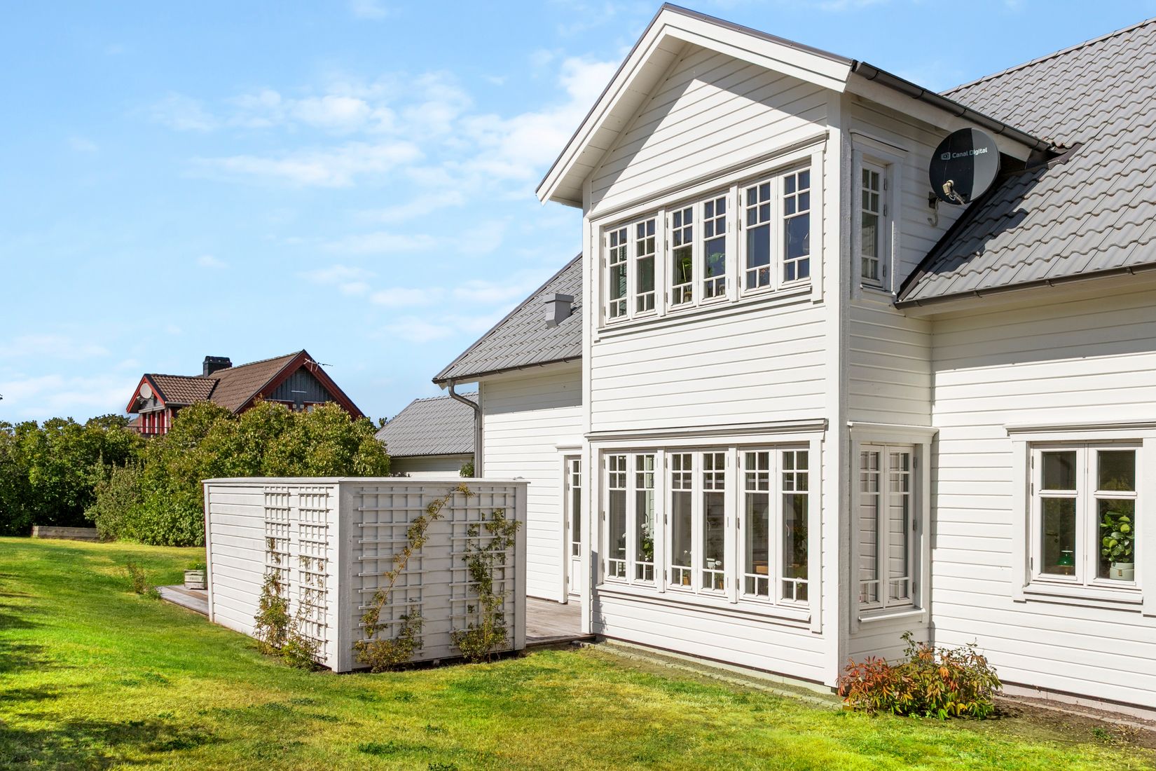Välkommen till denna klassiska och rymliga familjevilla i smakfull New England-stil – ett hem med tilltalande formspråk där tidlös estetik möter modern bekvämlighet. Fasaden med liggande vit träpanel, spröjsade fönster och harmoniska proportioner ger ett elegant och inbjudande första intryck.