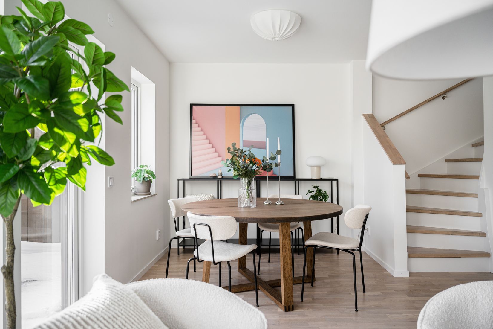 Här erbjuds ett boende med extra ljusinsläpp tack vare gavelläget samt en insynsskyddad och lättskött trädgårdstäppa som skapar en privat och trivsam utemiljö. Sommartid blir det generösa trädäcket en underbar förlängning på ca 21 kvadrat och en naturlig plats för härligt umgänge, frukost i solen och långa, ljusa dagar utomhus. Här suddas gränsen mellan inne och ute. Bostaden präglas av yteffektiva och flexibla kvadratmeter där planlösningen enkelt kan anpassas efter familjens behov. På entréplan möts ni av öppna och sociala ytor där kök och vardagsrum samspelar på ett inbjudande sätt. Stora fönsterpartier ger ett fint ljusflöde och skapar en luftig känsla genom hela våningsplanet. Övre plan erbjuder en mer privat sfär av hemmet med flera sovrum i bra storlek samt möjlighet till allrum eller arbetsyta - perfekt anpassad för barnfamiljen, hemmakontoret eller tonårshörnan. Den flexibla planlösningen ger goda möjligheter att forma bostaden efter livets olika skeden, där allrummet kan göras till ett fjärde sovrum. Bostaden har två badrum vilket skapar både komfort och smidighet i vardagen för den större familjen.