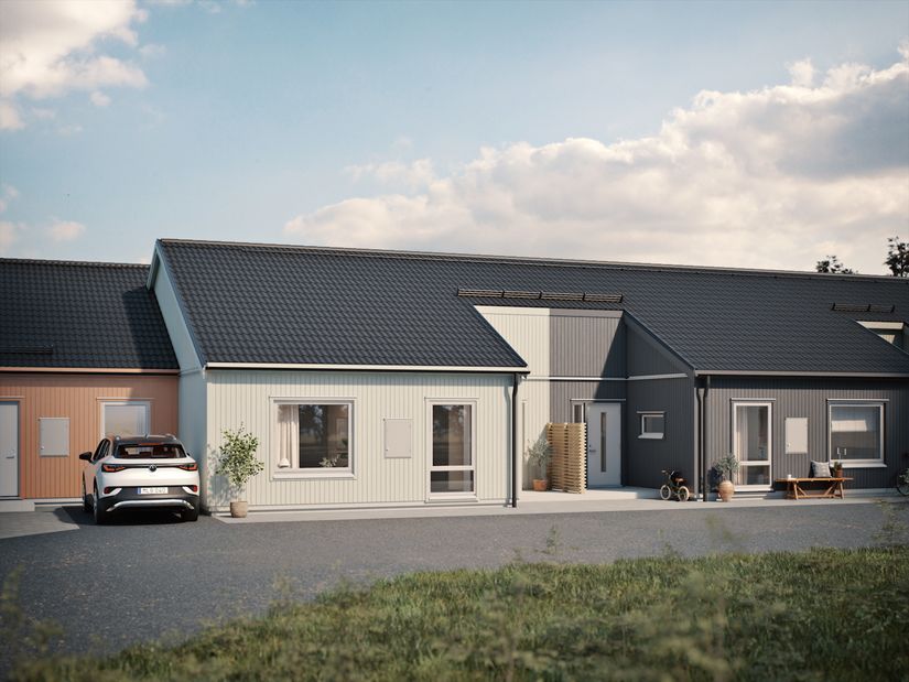 Det mindre av de två husen, på 77 kvm, passar perfekt för paret eller den lilla familjen som uppskattar sociala ytor och en lättskött planlösning. Här möts du av ett öppet samband mellan kök, matplats och vardagsrum - idealiskt för middagar, umgänge och lediga helger. Två sovrum, varav ett master bedroom med klädkammare, kompletteras av ett flexibelt rum som fungerar lika bra som gästrum, hemmakontor eller barnrum. Från vardagsrummet når du uteplatsen, en naturlig förlängning av hemmet under årets soliga dagar.