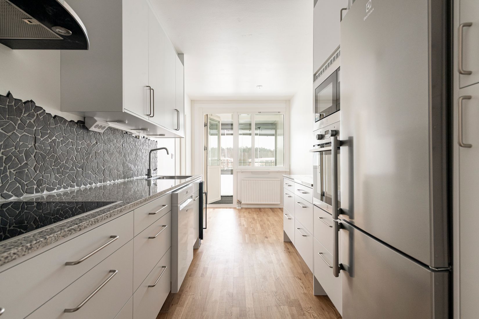 Vardagsrummet är luftigt och lättmöblerat med god plats för soffgrupp och övrigt möblemang. Det smakfullt renoverade köket från 2025 är fullt utrustat med generösa arbetsytor och plats för matgrupp. Härifrån nås även den inglasade balkongen som förlänger bostaden och fungerar som ett extra rum stora delar av året.