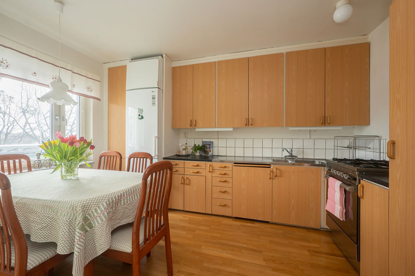 Köket är välplanerat med goda arbetsytor, plats för matbord samt praktiskt skafferi. Här finns gasspis - där gasen ingår i avgiften - vilket är ett uppskattat inslag för den matlagningsintresserade.