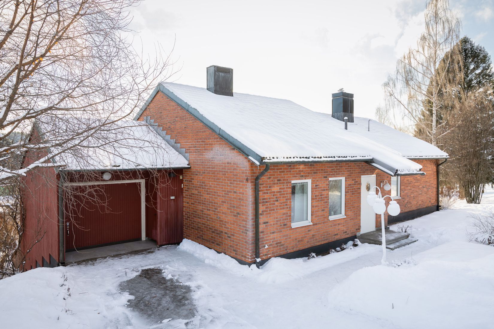 Ute väntar en omhändertagen uppfart med “Sigmasten” och plats för cirka tre bilar, samt ett vidbyggt och uppvärmt garage som ger både komfort och praktisk förvaring.